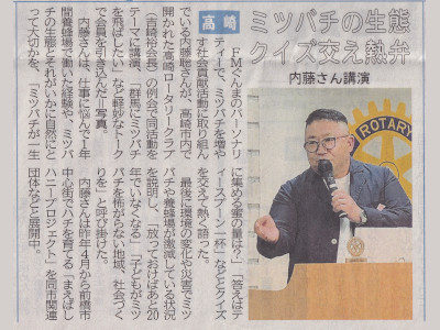 第06回例会ゲスト卓話 8月31日の例会で行われた、ラジオパーソナリティーを務める内藤聡さんの「ミツバチを増やす社会貢献活動」をテーマにした講演が9月2日の上毛新聞に取り上げられました。 内藤さん自身の経験やミツバチの生態等、クイズを交えた公演はとても引き込まれるものでした。 <前のページ 活動報告一覧に戻る 次のページ> トップページに戻る